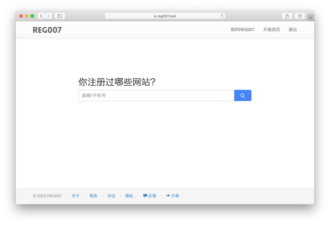 第一个要推荐的是 REG007,支持手机号和邮箱地址查询。这个网站的实现原理是通过收集各个网站的 api,利用同一个手机号只能注册一次的屏蔽原理,来检查你的手机号是否已注册过该网站。
