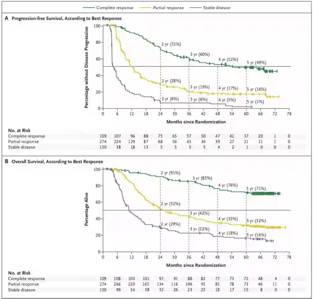 多因素分析显示,与生存相关的基线因素与既往研究结果吻合,而且3年和5年生存结果的相似性表明,基线预测指标不受评估时间的影响。5年无进展或存活的患者中,患者基线特征多表现为较低肿瘤负荷和较弱的侵袭性肿瘤动力学。完全缓解患者的预后特别好,5年无进展生存率和总生存率分别为49%和71%,而总体患者只有19%和34%。完全缓解和长生存患者的基线因素利于预后,表明初始疾病负荷较低是出现治疗反应且反应深度更大的有利因素,从而利于长期生存。根据治疗反应评价出的长期结果相关生物标记物,可能成为未来研究中早期评估的替代终点。本研究显示女性和长期生存相关,符合其他研究结果,但近期Meta分析显示相对疗效似乎男性获益更多。