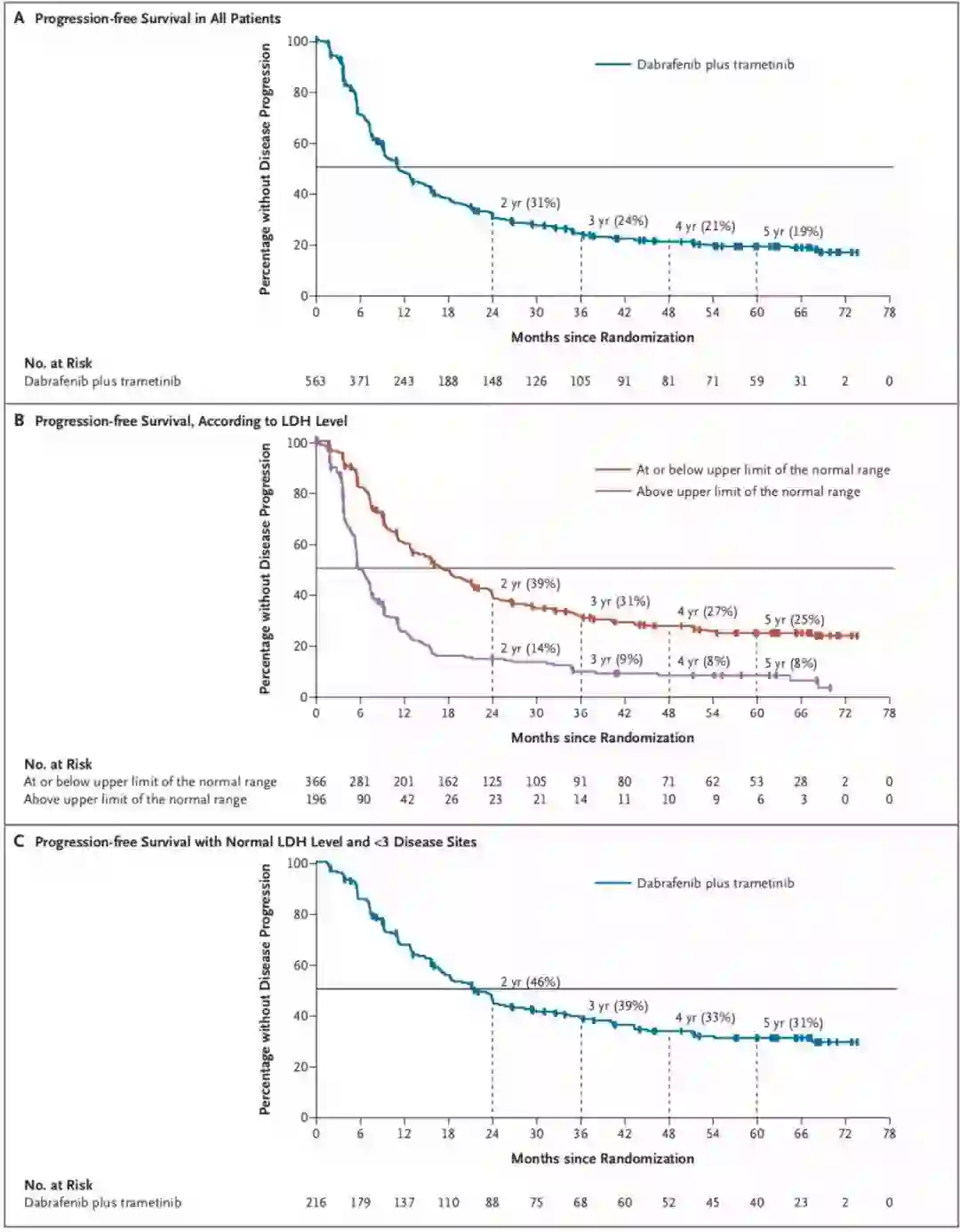 (A)COMBI-d or COMBI-v中所有接受dabrafenib联合trametinib治疗无法切除或转移黑色素瘤患者的无进展生存;(B)乳酸脱氢酶正常和增高患者的无进展生存;(C)基线时乳酸脱氢酶正常且少于3个疾病部位患者的无进展生存