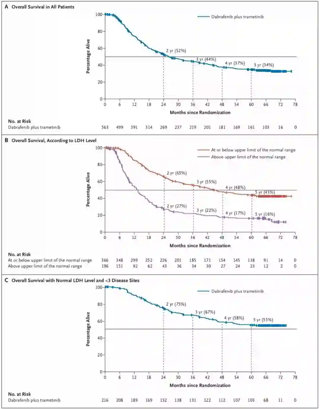 Combi-d和Combi-v研究证明了dabrafenib联合trametinib治疗预后极差的BRAF V600E或V600K突变黑色素瘤的疗效和安全性,并使得部分患者生存超过3年。近期Robert教授在《新英格兰医学杂志》(The New England Journal of Medicine,NEJM)发文,表明5年时仍有1/3患者生存,并再次证明乳酸脱氢酶、肿瘤初始负荷等因素与完全缓解和长生存明显相关。
