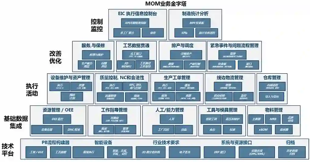 MOM系统顶层蓝图,描绘了MOM系统中管理的业务在流程的前后关系上连接到的有关部门和有关信息系统,以及生产单位执行过程的有关人、机、料、法、环、测等关键因素都源于哪些部门以及信息系统流程中的上下游关系。