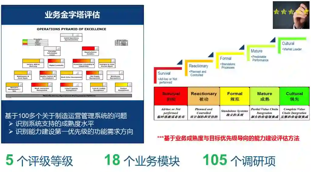 在中车长客,达索系统对中车长客开展了深入的业务咨询工作,分别从7项业务板块(IT、计划、工艺、生产、质量、物流、设备),调研咨询了239调研项内容,采用OMA(运营成熟度评估)模型,又再细分了18个业务模块,105个评估点,按照初始、被动、规范、成熟、领先5个等级对中车长客做了深度“体检”。18个业务模块覆盖了MOM(制造运营管理)的方方面面,对MOM的各业务模块的现状与预期有了定量的评估,同时结合实施代价与优先级,为中车长客的后续实施路线做了有力的支撑。