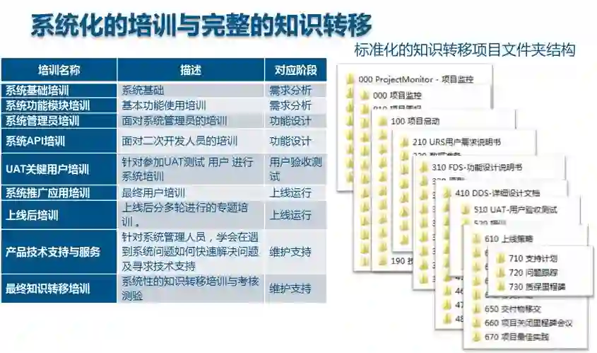 项目稳定上线后,需要顺利地将系统移交给客户维护团队,所以在项目实施过程中的培训与知识转移,以及专业的项目文档交付物非常重要,达索系统的PERFORM实施方法论中非常注重此内容,在需求分析、功能设计、用户验收测试、上线运行、维护支持各个阶段都有详细的用户培训,并且所有项目交付物都有严格规范的项目文件夹结构,项目后期需要以此标准化的项目文件夹结构存放文档,作为知识移交给客户维护团队。