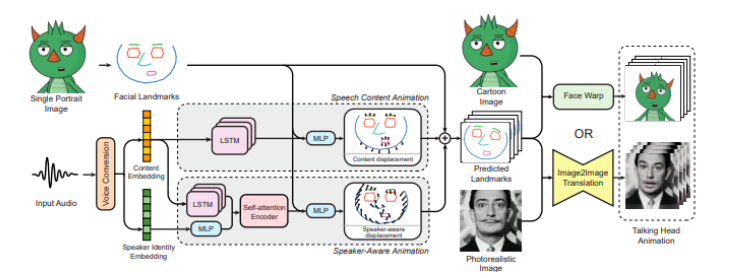 MakeItTalk是一个新的深度学习为基础的架构,能够识别面部标志、下巴、头部姿势、眉毛、鼻子,并切能够通过声音的刺激使嘴唇发生变化。