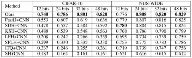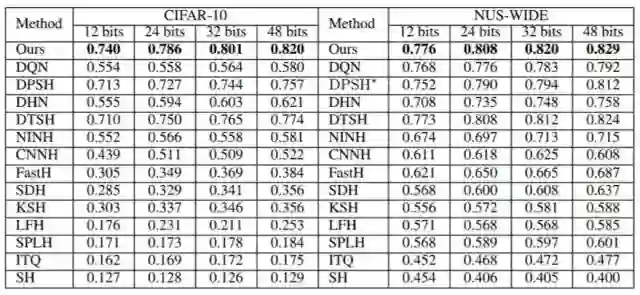 表 1:第一组实验设置下不同方法的 MAP。NUS-WIDE 数据集的 MAP 是根据返回的前 5,000 位邻近值计算的。DPSH * 表示重新运行 DPSH 作者提供的代码。