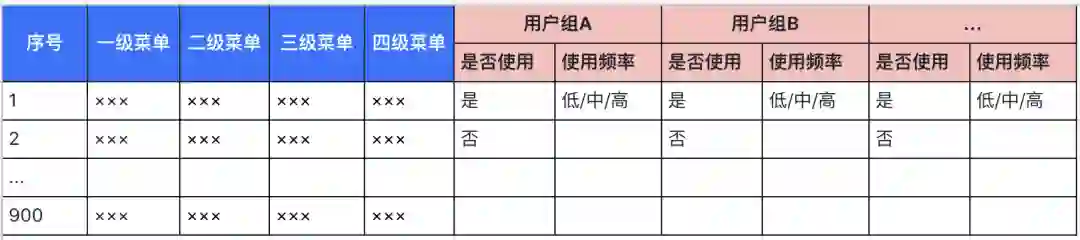 梳理那些没人用的页面,根本就是浪费时间。我们要搞清楚用户到底常用哪些页面,压根不用的页面就不梳理。于是,我们继续梳理页面优先级。将之前整理的页面菜单Excel的列后,再加上目前主要使用系统的各大用户组。