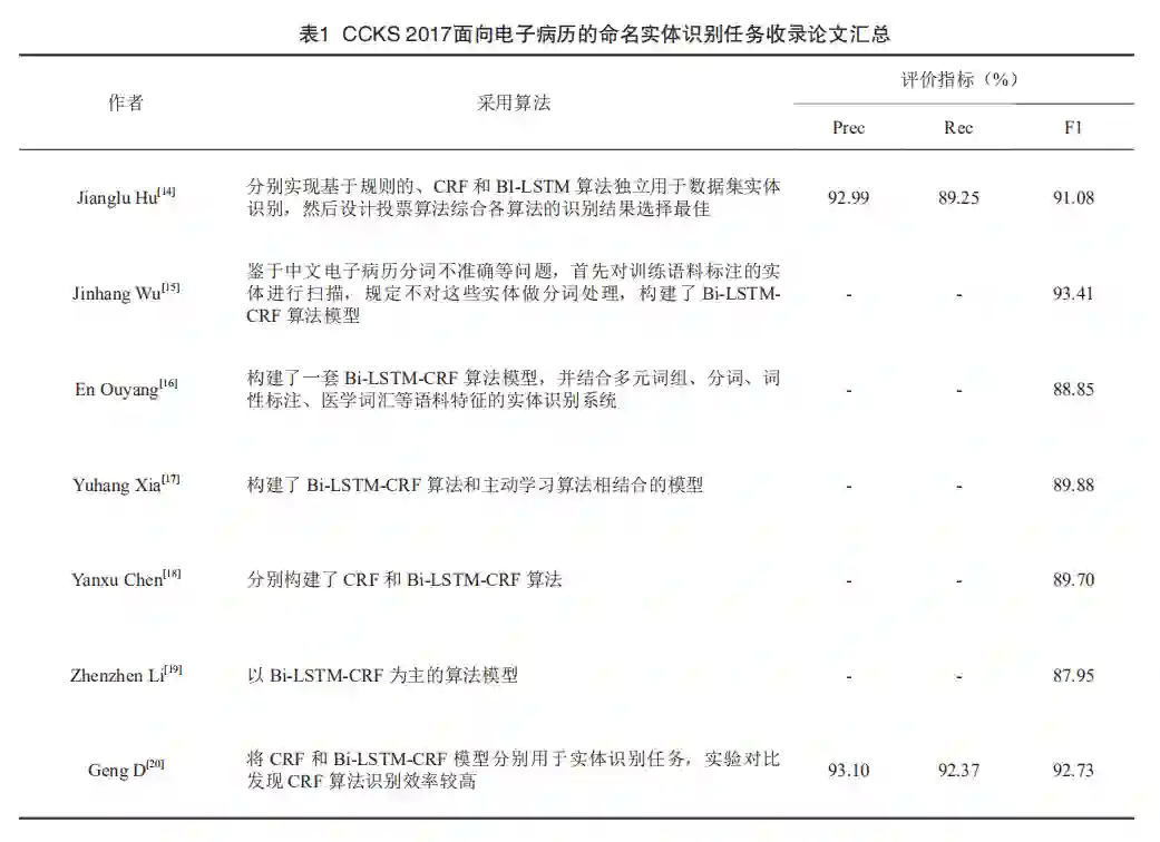 Liu等设计不同特征模板和上下文窗口进行条件随机场的学习训练,进行模型实体识别效率的比对分析,以寻找最佳的电子病历特征模板和上下文窗口。Liu等在i2b2 2010,2012和2014语料上实验对比了Bi-LSTM-CRF与传统的CRF实体识别算法的性能,结果表明Bi-LSTM-CRF性能较好。CCKS 2017学术评测任务二:面向电子病历的命名实体识别,共收录了7篇论文,研究内容和测评结果等见表1。总体上看,7篇论文均有对Bi-LSTM-CRF(或Bi-LSTM)算法模型的实现;均采用“字粒度”模型使用word2vec工具将输入文本特征向量化表示。Zhang等利用CCKS 2017开放的电子病历语料,分别采用CRFs和Bi-LSTM-CRF两种统计机器学习算法从电子病历数据集中识别疾病、身体部位和治疗等信息,并对两种方法进行了对比分析,发现后者性能较好。Qiu等为提高循环神经网络模型的训练速度,提出了残差卷积神经网络条件随机场模型(RD-CNN-CRF)在CCKS 2017开放测试语料上获得了较Bi-LSTM-CRF更高的训练速度和F1值。CCKS 2018学术评测任务一:面向中文电子病历的命名实体识别,共收录论文2篇,分别是Yang等将词嵌套、词性、偏旁部首、拼音、词典和规则特征作为条件随机场(CRFs)的学习特征,实验F1值为89.26%;Luo等基于多特征(如标点符号、分词和词典等特征)融合,整合CNN-CRF, Bi-LSTM-CRF, Bi-LSTM-CNN-CRF, Bi-LSTM+CNN-CRF和Lattice LSTM五种神经网络模型,实验F1值最高达到了88.63%(表1)。