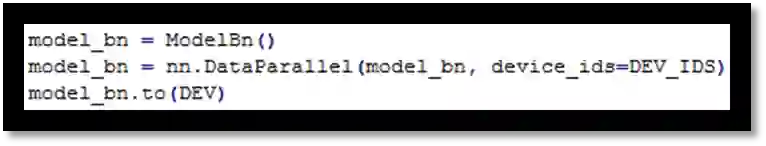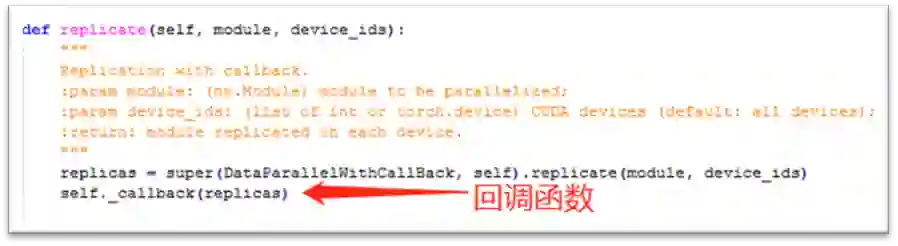 在这里,可以设计一个继承nn.DataParallel的子类DataParallelWithCallBack,重载了replicate方法,子类的该方法先是调用父类的replicate方法,然后调用一个自定义的回调函数(这也是之所以命名为DataParallelWithCallBack的原因),该回调函数用于将各卡对应的 SyncBN 层关联起来,使得它们可以通过某种数据结构进行通信。