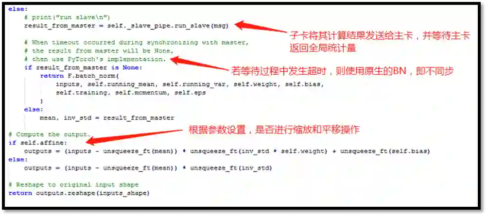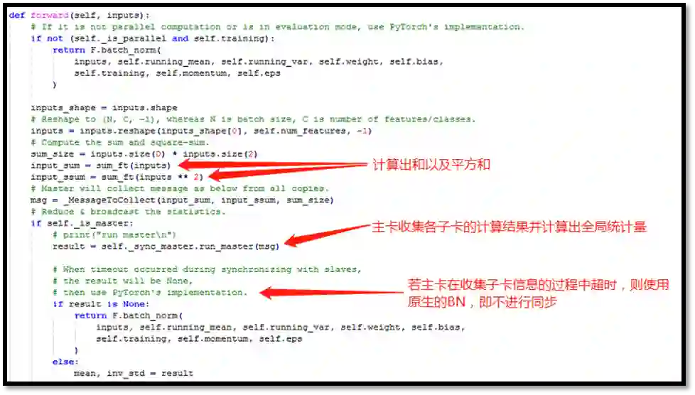 ,然后主卡上的 SyncBN 收集来自各个子卡的计算结果,从而计算出全局的均值和方差,接着发放回各个子卡,最后各子卡的 SyncBN 收到来自主卡返回的计算结果各自进行归一化(和缩放平移)操作。当然,主卡上的 SyncBN 计算出全局统计量后就可以进行它的归一化(和缩放平移)操作了。
