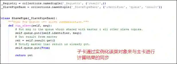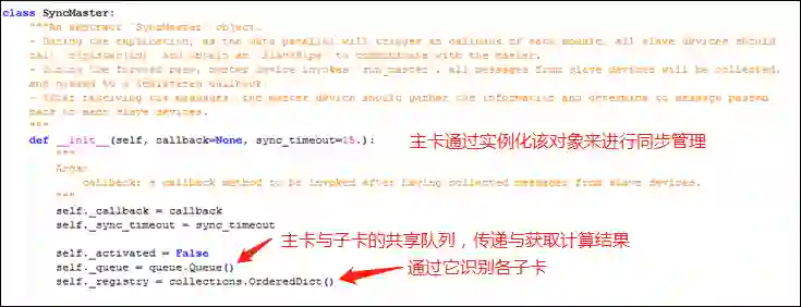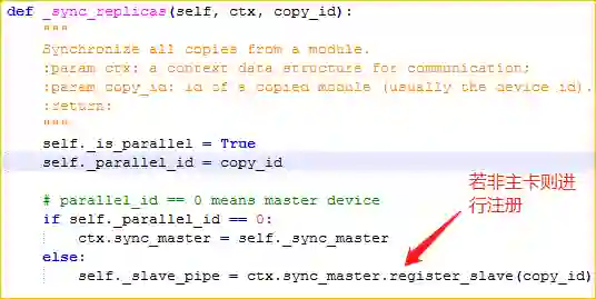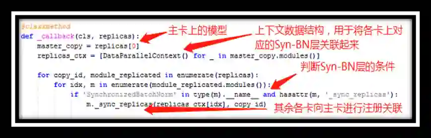自定义的回调函数,将各卡对应的Syn-BN层进行关联,其中DataParallelContext是一个自定义类,其中没有定义实质性的东西,作为一个上下文数据结构,实例化这个类的对象主要用于将各个卡上对应的Syn-BN层进行关联;_sync_replicas是在Syn-BN中定义的方法,在该方法中其余子卡上的Syn-BN层会向主卡进行注册,使得主卡能够通过某种数据结构和各卡进行通信。