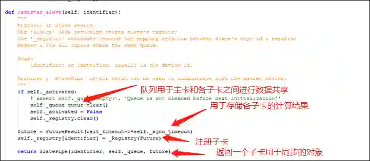 由上可知,我们需要在 SyncBN 中实现一个用于同步的注册方法,SyncBN 中还需要设置一个用于管理同步的对象(下图中的 _sync_master),这个对象有一个注册方法,可将子卡注册到其主卡。