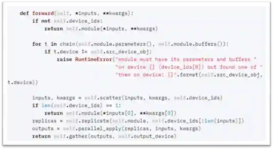 熟悉 pytorch 的朋友们应该知道,在进行GPU多卡训练的场景中,通常会使用nn.DataParallel来包装网络模型,它会将模型在每张卡上面都复制一份,从而实现并行训练。这里我自定义了一个类继承nn.DataParallel,用它来包装SyncBN,并且重载了nn.DataParallel的部分操作,因此需要先简单说明下nn.DataParallel的前向反馈涉及到的一些操作。