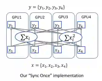 ,然后进行同步求和,即可计算出全局的方差。同时,全局的均值可通过各卡的