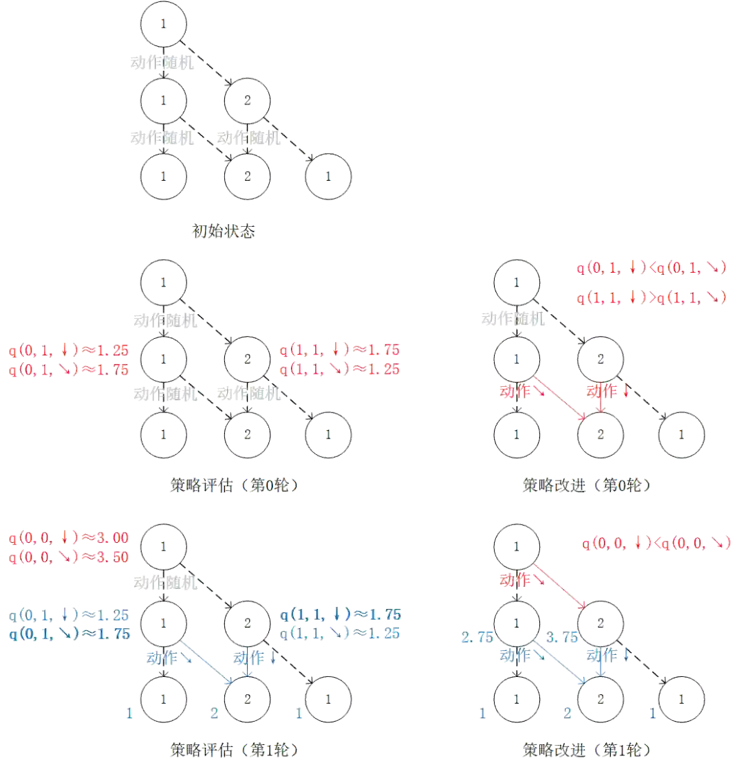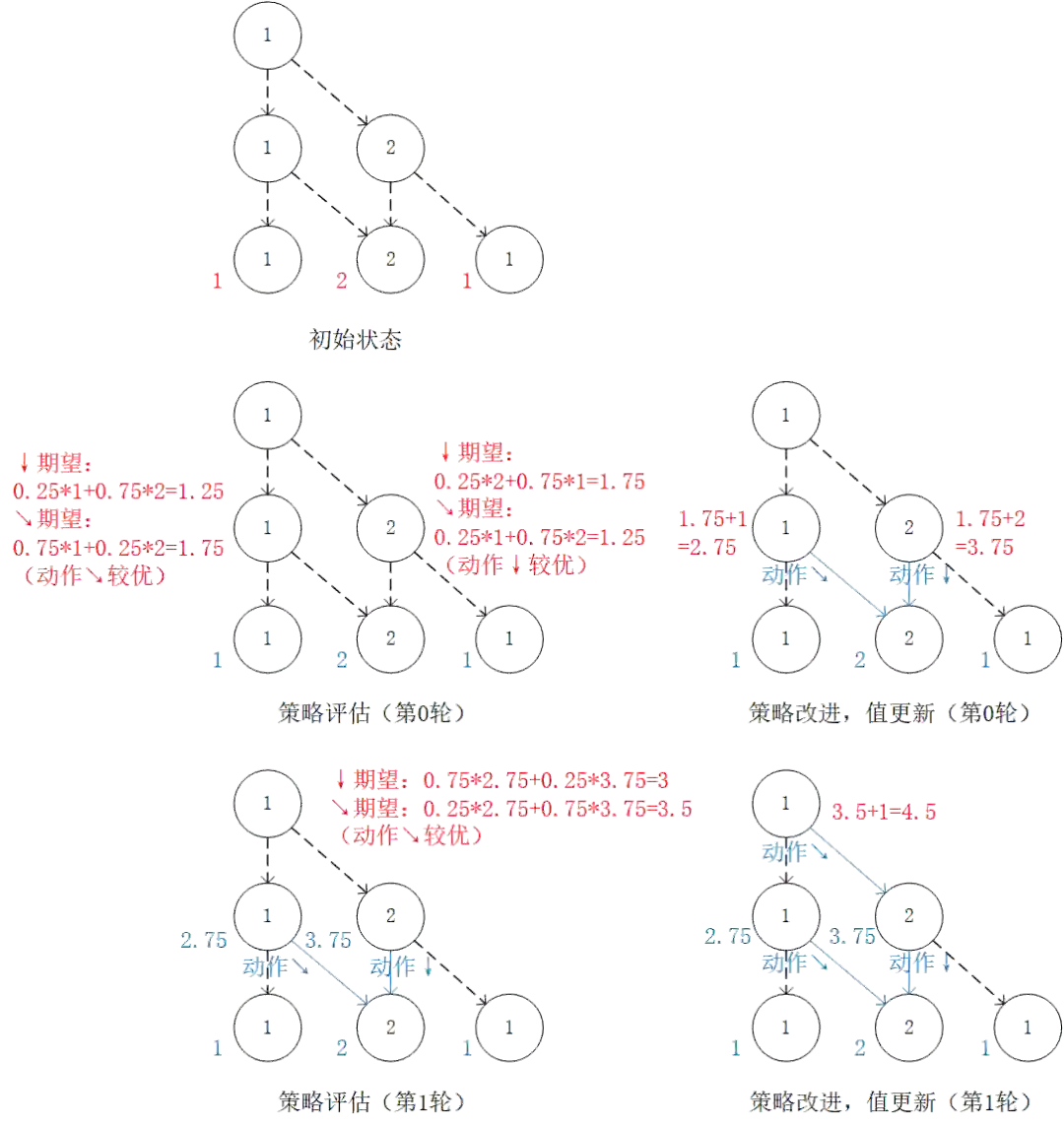 我们也可以从智能体在每个坐标 (i, j) 所做的动作 出发来观察 (4) 式。在每一轮迭代中,先分别计算两种动作带来的未来收益期望(策略评估),然后取收益较大的动作作为 的取值(策略改进),最后根据动作更新 。