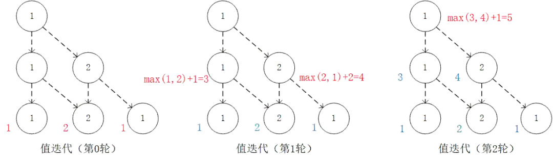 通过对 的值进行三轮迭代计算 。在每一轮迭代中,对于坐标(i, j),分别取得当 和 时的“未来将会获得的数字之和的最大值”(即 和 ),取两者中的较大者,并加上当前坐标的数字 。