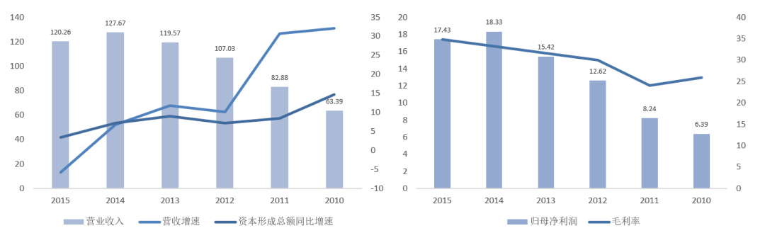 在2010年到2014年四年间,我国资本形成总额同比增速处于较高水平,正泰电器又在2012年进行了小规模的并购。行业高景气叠加并购带来的业务扩张,公司的营业收入也稳步增长,从2010年的63.39亿元增长至2014年的127.67亿元。