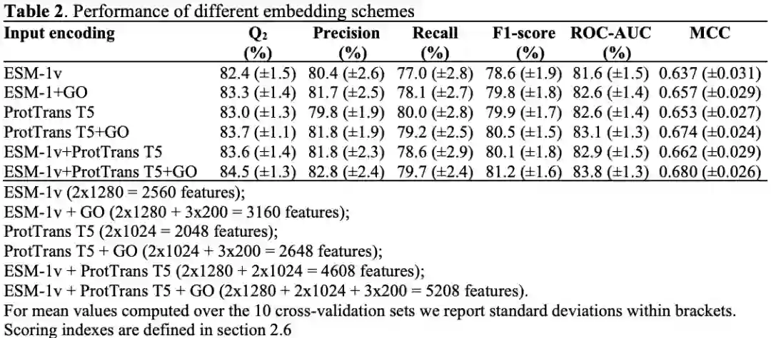 为了选择最佳的输入编码,作者进行了不同的实验来测试各种组合输入特征。使用不同的输入特征,用交叉验证训练了几个独立的SVM+PCA模型,并使用MCC评分选择最优模型。GO term提供了全局蛋白质信息。它们的嵌入表征没有考虑特定的变异位点。如果仅考虑平均嵌入GO term的向量进行预测,则预测性能非常低,MCC为0.27。不同的输入编码对应不同的预测器,其执行方式不同。