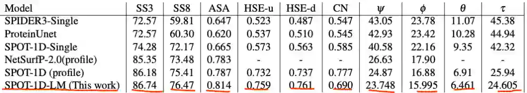 作者开发的SPOT-1D-LM与基于单序列的预测因子SPOT-1D-single、ProteinUnet,SPIDERSingle3,PSIPRED-single和ASA-Quick方法进行了比较。也与基于profiled的方法SPOT-1D和NetSurfP-2.0进行了比较(对应代码在下面)。