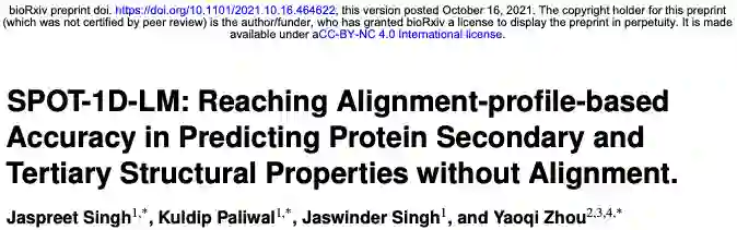 这一巨大的改进使得基于多序列比对生成的序列谱预测这些1D结构特性的精度达到或优于当前最先进的技术。二级和三级结构特性的高精度预测表明,在没有同源序列的情况下,可以对蛋白质结构进行高精度预测,这是后AlphaFold2时代的剩余阻碍。