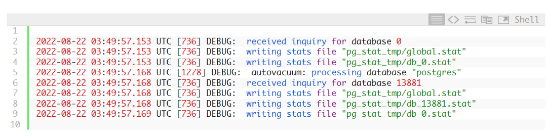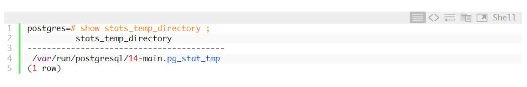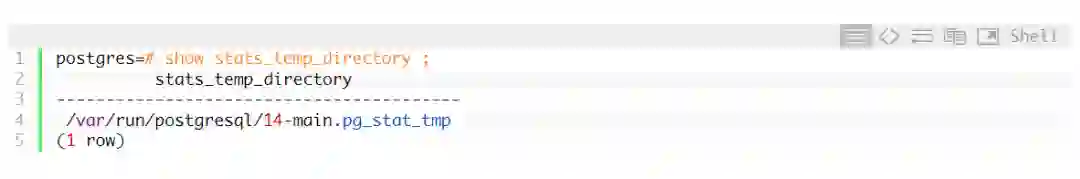 下图是参数值stats_temp_directory所指向的位置。在许多系统上,它将是数据目录中pg_stat_tmp。在Ubuntu/Debian上,它将在/var/run/postgresql中,例如: