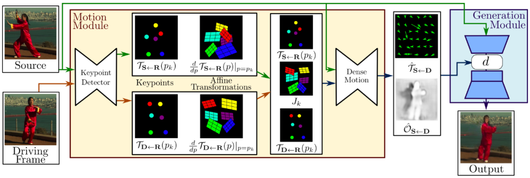 这个项目主要借助今年三月份发布的一篇 arXiv 论文《First Order Motion》,无需事先对目标图像进行任何训练,就能用另一个人的视频来替换自己的图像。