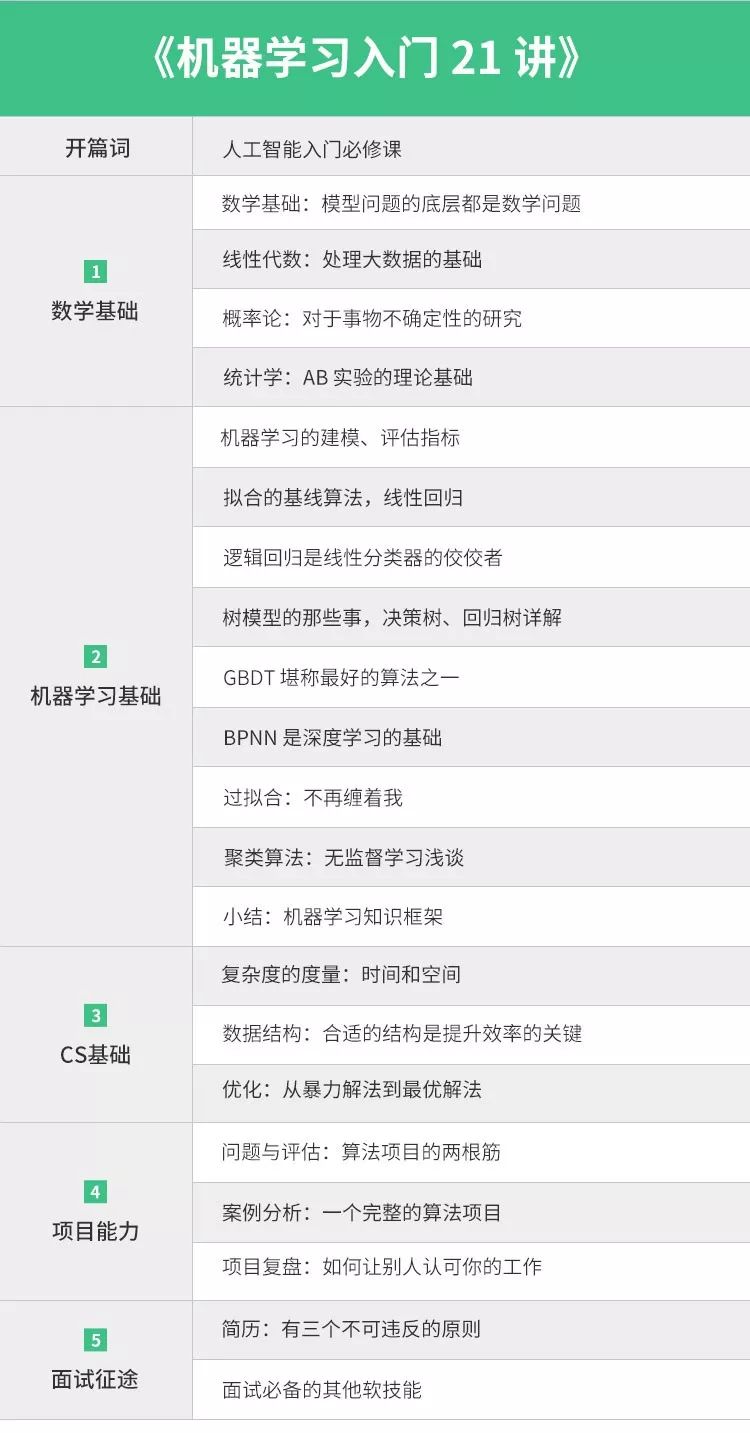 有鉴于此,我在拉勾上开设了一门课程《机器学习入门 21 讲》。拆解机器学习主流模型,找到主流模型背后依赖的数学知识点。再讲这些数学相关的知识点,进行统一整合归并。