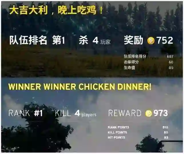 而谁最后能活下来,屏幕上就会显示“大吉大利,今晚吃鸡”(Winner winner, chicken dinner)这句话。