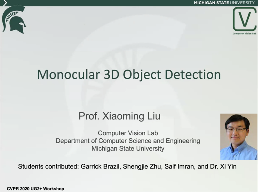 来自美国密西根州立大学的Xiaoming Liu副教授报告了《Monocular 3D Object Detection》的内容。他介绍了一种利用2D和3D透视图的几何关系帮助解决复杂的3D参数估计问题,并进一步介绍了基于深度感知(depth-aware)的卷积层来提取特定位置相关的特征,从而进一步改善网络模型对3D场景的理解能力,并提升单镜头下的三维物体检测准确率。