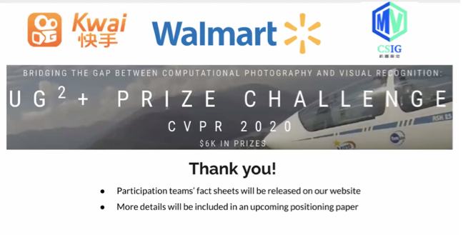 年6月14日-19日,国际计算机视觉与模式识别顶级会议CVPR2020在线上召开虚拟会议。期间,CVPR 2020 UG2+ workshop on “Bridging the Gap Between Computational Photography and Visual Recognition”研讨会及竞赛报告会以云直播的方式于6月19日成功召开,本次研讨会由电气与电子工程师协会(IEEE)主办,CSIG-机器视觉专委会、美国德州农机大学、北京大学、大连理工大学、中科院信工所等联合承办。