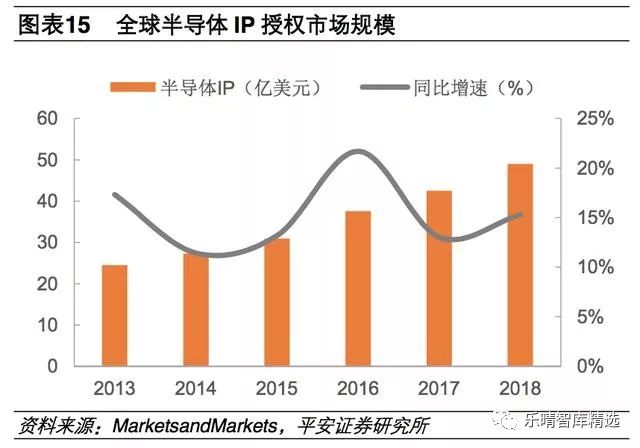 这种类似搭积木的开发模式,缩短了芯片开发的时间,提升了芯片的性能。全球半导体IP市场在2018年整体市场规模为49亿美元。其中ARM公司是IP领域绝对龙头,占41%市场份额。