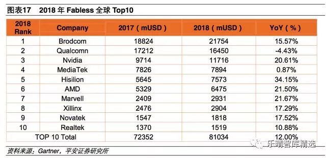 根据2018年ICInsights数据,2018年国内半导体设计公司销售收入约385亿美金,海思和紫光展锐(均未上市)合计销售额超过了100亿美金,占国内市场规模的26%,剩余1700余家半导体设计公司产生了280亿美金的收入。