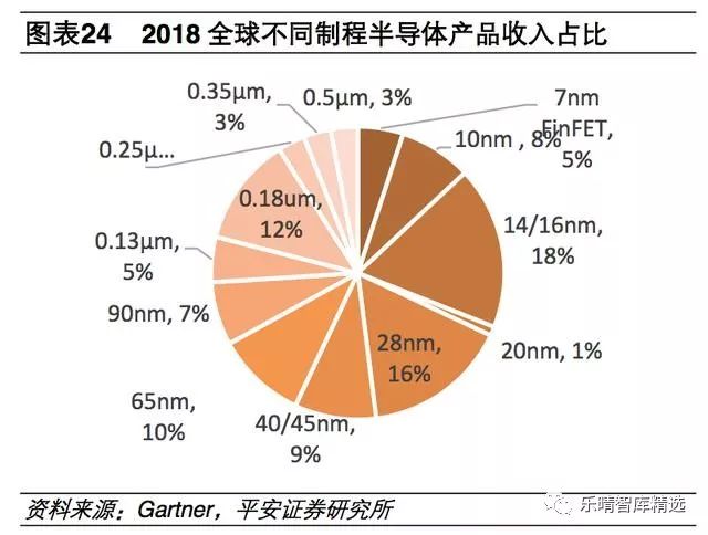 从制程工艺来看,顶尖工艺(7nm+10nm)目前占据13%的市场份额,主要用于CPU、GPU等超大规模逻辑集成电路的制造。主要用于存储芯片制造的14nm-28nm工艺占据了34%的市场份额;MCU/MPU、模拟器件、分立器件和传感器主要使用40nm以上工艺,占据了剩余的41%市场份额。