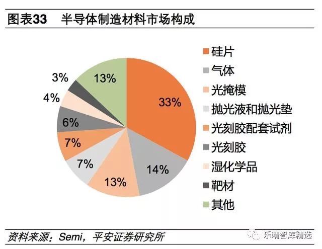 硅片、气体、光掩模和光刻胶四种材料占整体比例67%以上,其中硅片是半导体材料的核心。