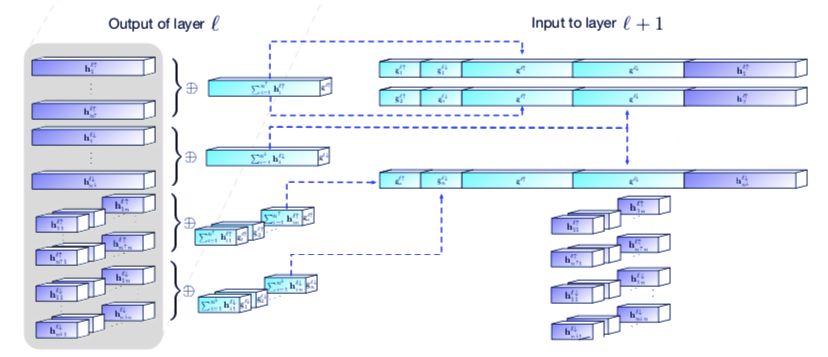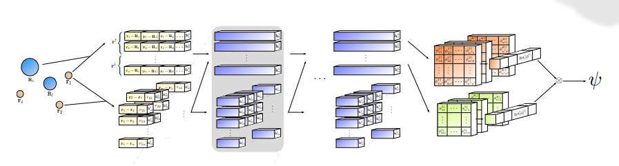图 1:费米子神经网络(Fermi Net)。上图:全局架构。一个或两个电子位置的特征是该网络的不同串流的输入。这些特征经过几层的变换,再应用一个行列式,然后在那个位置的波函数就作为输出。下图:单一一层的细节。网络将具有同样自旋的电子的特征放到一起求平均,然后将这些特征连接起来,为每层构建一个电子位置的等变函数。