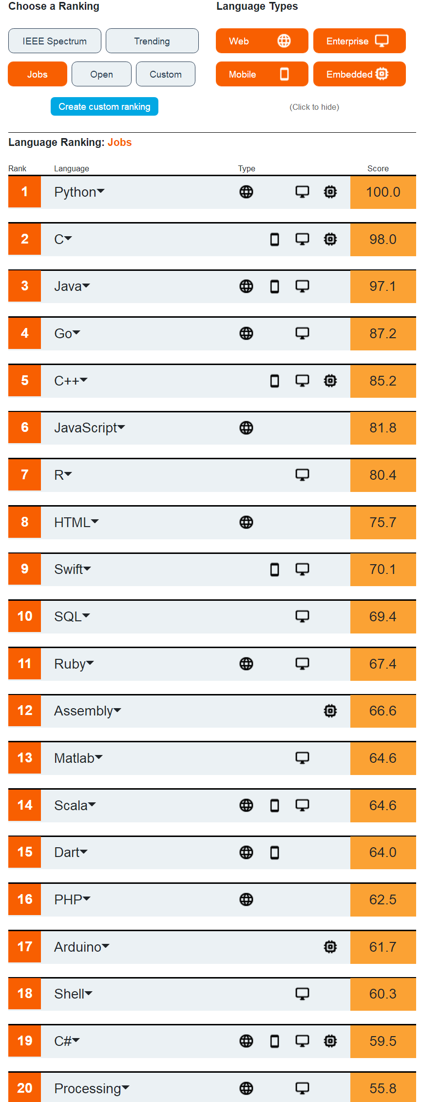 根据 IEEE Spectrum 编程语言排行榜显示,除了 Python 之外,Java 和 C 语言分别位居第二、第三为。其次是 C++、JavaScript。