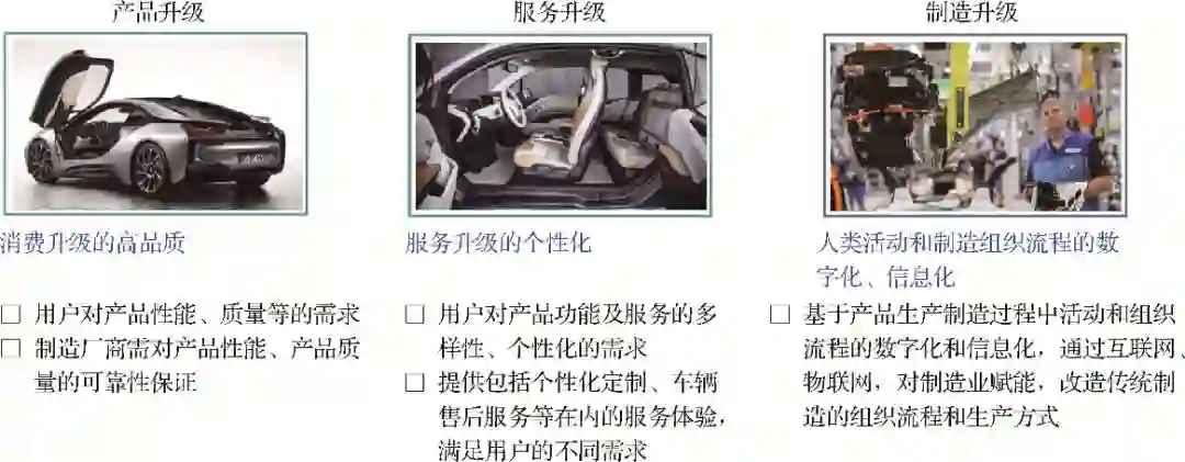 《中国制造2025》是以两化融合为主线,以推进智能制造为主攻方向,说到底是要解决新一代信息化技术变革带来的制造业产业升级的问题。应主要围绕“产品升级、服务升级、制造升级”来展开。图15为我们理解的智能制造的终极目标,即不断适应消费升级的高品质需求、服务升级的个性化需求和人类活动、制造组织流程的数字化、信息化过程的需求。