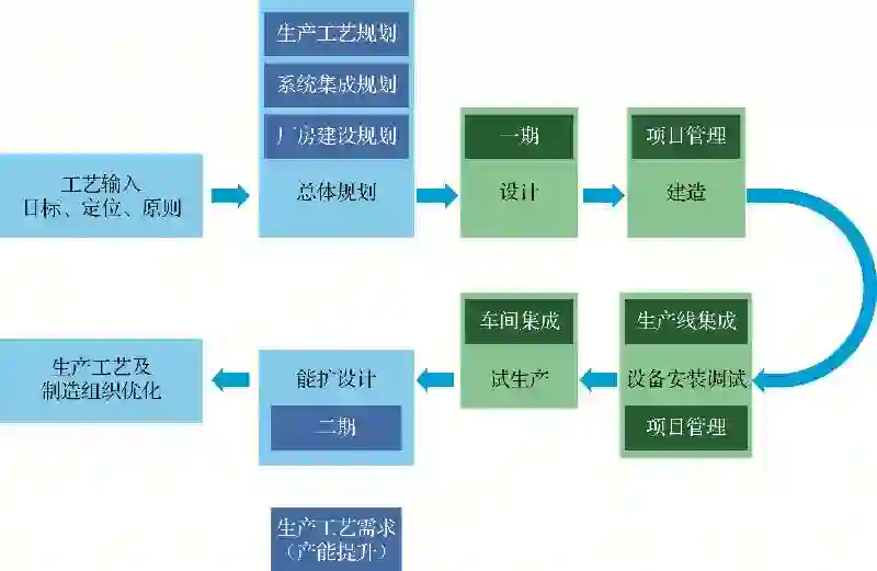 根据项目建设目标要求及产品特点,项目在规划阶段进行了生产工艺规划、系统集成规划、厂房建设规划三方面工作,智能制造顶层规划涵盖并贯穿上述三方面。详图6是总体设计系统实施架构,智能制造顶层规划设计应有机地贯穿和服务于生产工艺规划、系统集成规划、厂房建设规划,并通过生产线集成、数字化车间集成,最终完成智能工厂集成。