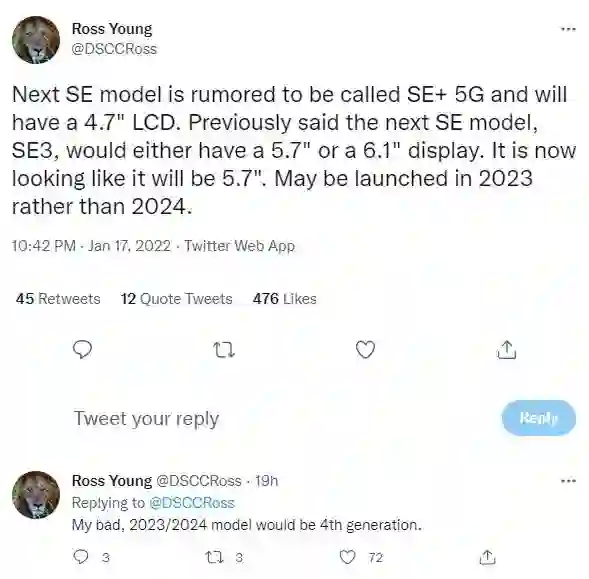 第三则爆料来自显示屏供应链咨询的 Ross Young,它表示今年的 iPhone SE 将被称为“iPhone SE+ 5G”,搭载 4.7 英寸 LCD 显示屏,而所谓的“iPhone SE 3”实际上是 SE 4,会有 5.7-6.1 英寸大屏,现阶段看更可能是 5.7 英寸,预计 2023 年发布而不是 2024 年。