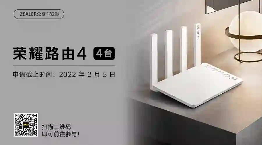 过年王者要快速上位?别让网速拖后腿!本期 ZEALER 众测新品——荣耀路由 4。WiFi6 千兆路由,3000Mbps 无线速率,让你畅享游戏和 8K 大片;高通 CPU+NPU 解决方案,多连不卡更稳定;四根高增益天线,超广覆盖范围,穿墙更是小 case!扫上方二维码或戳左下角「阅读原文」即可申请免费试用。