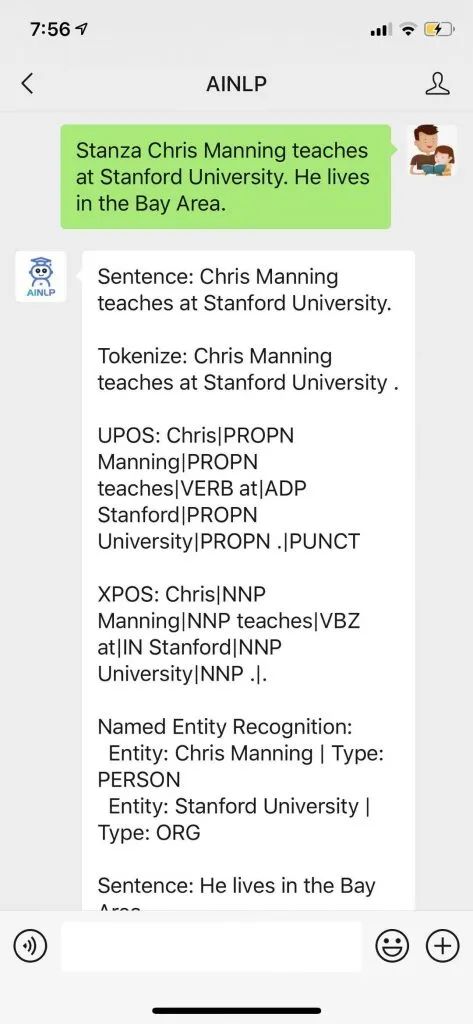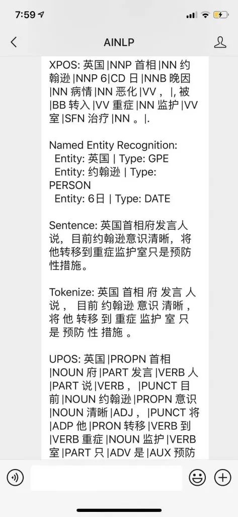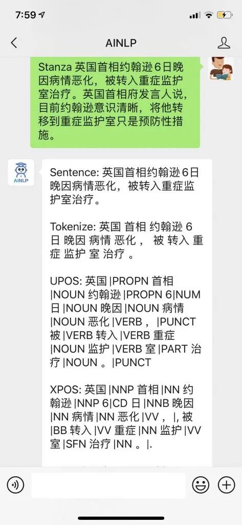 我将Stanza的中英文模块部署在了AINLP的后台,使用的就是CPU,感兴趣的同学可以关注AINLP公众号,对话测试,Stanza+分析内容触发,会自动判断语言选择不同的Pipeline: