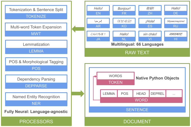 Full neural network pipeline for robust text analytics, including tokenization, multi-word token (MWT) expansion, lemmatization, part-of-speech (POS) and morphological features tagging, dependency parsing, and named entity recognition;