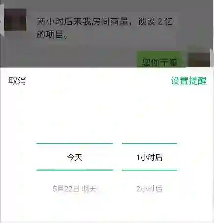 在微信上有一个消息提醒功能,相当于一个闹钟,到了指定时间后,微信自动发一条消息提醒你:该干活了,社畜。
