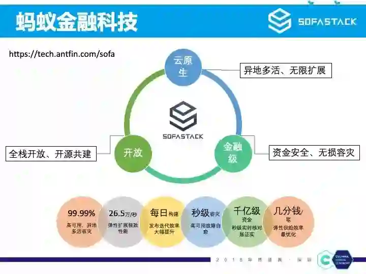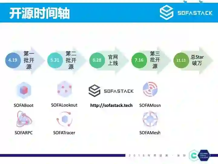2015 年 9 月蚂蚁金融云对外正式发布,在今年 9 月的云栖大会,蚂蚁金融云正式升级为蚂蚁金融科技,并宣布技术全面对外开放,其中就包括金融级分布式架构 SOFAStack,左上角就是网址,感兴趣的朋友可以看下:https://tech.antfin.com/sofa。