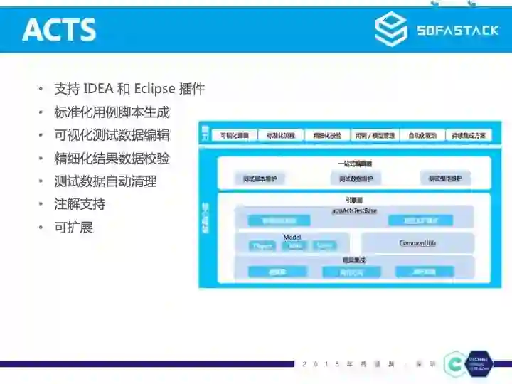 大家知道对于开发来说,写测试用例其实是一个比较复杂的事情,特别在开发人员水平参差不齐、业务系统又比较复杂的时候。ACTS 是数据对象模型驱动测试引擎的新一代测试框架,致力于提高开发测试人员编写测试用例的效率,给开发人员一个更好的测试体验。ACTS 支持了 IDEA 和 Eclipse 两种 IDE 插件,开发人员可以在 IDE 里直接生成标准化的测试用例,然后再通过可视化的测试数据编辑,对结果可以精细化校验,测试数据也会自动清理。另外支持 API 重写提高测试代码的可拓展可复用性,提供特有注解提高测试代码编排的灵活性。
