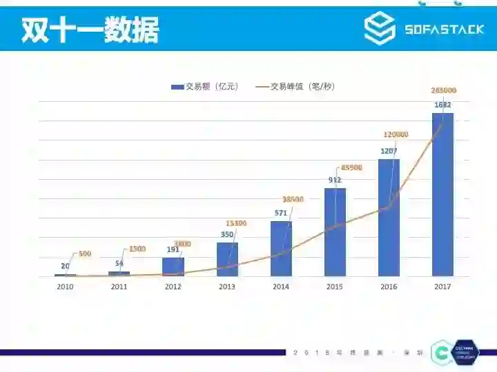 这是历年来的双十一数据图,柱状是双十一的交易额,从最初到20亿到去年的1682亿,今年是2135亿。而这个橙色的折线则是支付宝双十一 0 点的交易峰值,去年是 26.5w笔每秒,今年更高。从这两组数据可以看出蚂蚁的业务每年都是在高速增长,那技术面临的压力更是在不断的增长。但是最近几年,峰值虽然越来越大,但是大家有个体感,就是大促的购物体验更好了,再也不像以前系统会被大促搞挂,系统反而越来越稳了。