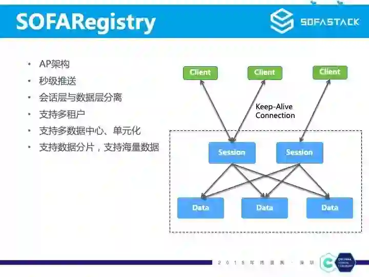 SOFARegistry 和 Zookeeper、etcd 注册中心不同的是,它是属于 AP 架构,保证高可用和数据的最终一致。注册中心客户端和注册中心之间是长连接,当订阅数据发生变化的时候,注册中心是推送数据给注册中心客户端的。为了保持大量的长连接,我们将注册中心分为了两种角色,Session 节点和 Data 节点,Session 节点保持与客户端的长连接,Data 节点存储数据。SOFARegistry 还原生支持多数据中心以及单元化场景。在蚂蚁金融云上,SOFARegistry 新增加了 Meta 节点角色用于支持多租户以及数据分片,这就使其拥有了支持海量服务注册信息存储的能力。