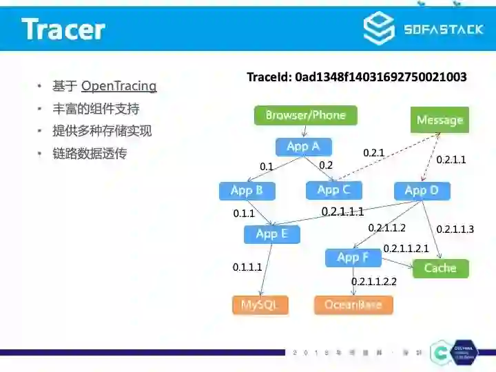 SOFATracer 基于 OpenTracing 规范,提供了丰富的组件支持,例如 Servlet/SpringMVC/HTTPClient/RPC/JDBC 等组件,同时也支持 OpenTracing 官方已经集成的实现。SOFATracer 提供了底层多种存储实现,可以落地到磁盘或者直接汇报到远程服务端。同时 SOFATracer 还提供了链路数据透传的能力,广泛用于全链路压测等场景。