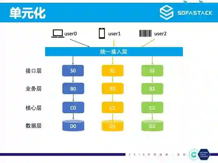 为了解决上面的跨机房数据访问、数据库连接数瓶颈以及未来数据水平扩展的问题,蚂蚁的工程师们设计了一套单元化的架构,这是单元化的一个示意图。在没有单元化的时候,用户请求进入内部后,所有请求链路都是随机走的,例如图里的 S0 到 B1 到 C2 到 D0。首先蚂蚁的请求都是跟用户相关的,所以我们将数据按用户的维度进行水平分片,例如这张示意图我们将所有用户分为三组。然后我们将我们的应用也部署成三组独立的逻辑单元,每个逻辑单元的应用和数据都是独立的,相当于每个逻辑单元都处理1/3总量用户的数据。