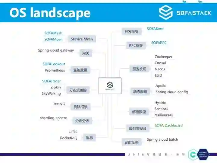 另外这张是我们的 OpenSource Landscape,目前只开源了部分组件,部分组件还在开源准备中,虽然不少内部组件没有开源,但是在每个微服务领域我们都会打通当前已经开源的比较成熟的组件。例如微服务里的服务发现,我们没有开源内部的 SOFARegistry,但是我们对接了 ZooKeeper/etcd/nacos 等业界成熟的注册中心产品,又例如分布式跟踪,我们虽然开源了自己的 SOFATracer,但是在 SOFARPC 我们也提供 skywalking 作为我们的分布式跟踪的实现。通过保持和业界众多优秀开源产品的兼容性,使得 SOFAStack 有更多可能。