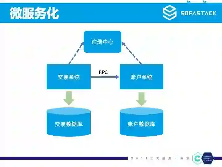 所以支付宝就对大系统进行了拆分,将原来的一个单体应用内部的多个模块变成了多个独立的子系统,这算是典型的 SOA 化的架构。最开始系统之间是使用 F5 的硬件负载设备来做系统间的负载均衡,但由于 F5 设备存在单点的问题,所以后面就在中间引入一个注册中心的组件。服务提供者去注册中心注册服务,服务消费者去注册中心订阅服务列表,服务消费者通过软负载方式通过 RPC 框架直接调用服务提供者。这在现在看来是一种非常显而易见的服务化架构,但当时 07 年就采用这样的架构还是算比较超前的。 支付宝在做系统拆分的同时,对数据库也按子系统进行了垂直拆分。数据库的拆分就会引入分布式事务的问题,蚂蚁金服中间件就提供了基于 TCC 思想的分布式事务组件 DTX。
